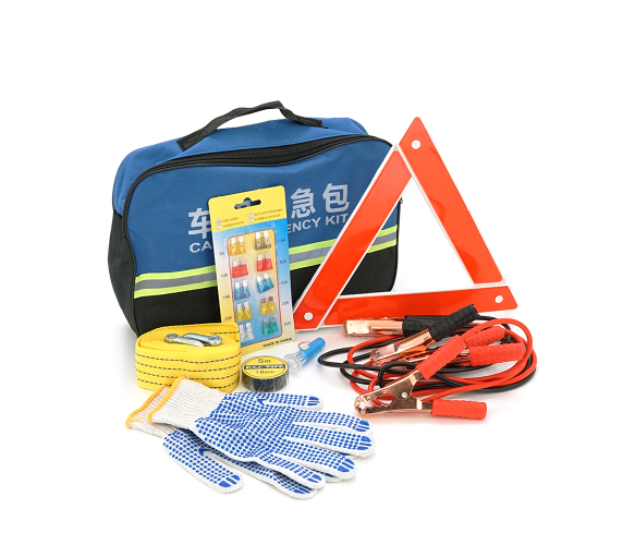 Набір для автомобіліста, що включає крокодили, буксирувальний трос, рукавички та підстилку, призначений для використання при позаштатних ситуаціях на дорозі.