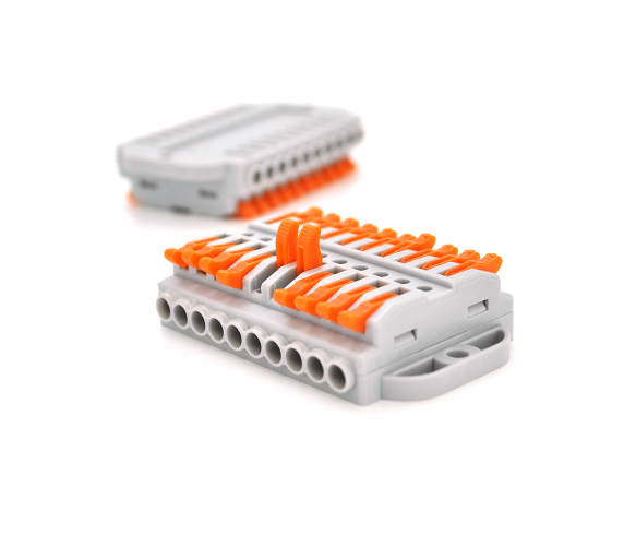 Клемна колодка з натискними затискачами 10-провідна WAGO K223-10P призначена для використання в розподільчих коробках. Вона має сірий колір та складається з 10 контактних пінів.