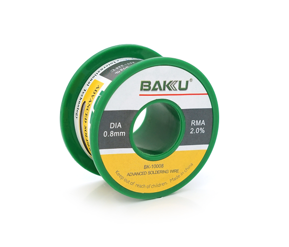 Технічні характеристикиПрипій BAKKU дротянийЗміст олова Sn 97%Вміст срібла Ag 0,3%Зміст міді Cu 0,7%Зміст флюсу 2%Діаметр 0,8 ммВес 50 г