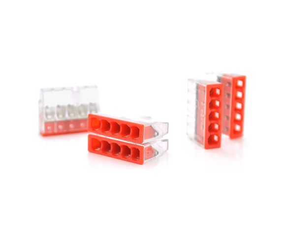 Самозатискна 5-провідна клема WAGO К773-205 призначена для з'єднання до п'яти дротів. Вона має прозоро-червоний колір, що робить її легко помітною.