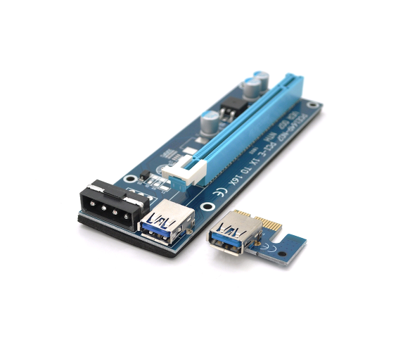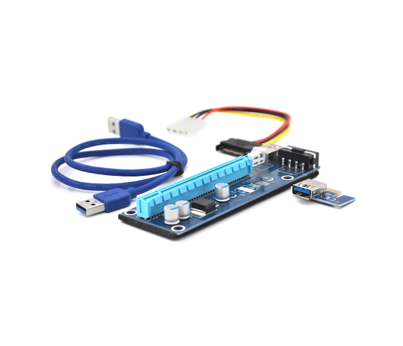 Цей набір включає Riser PCI-EX, який дозволяє підключити x1 пристрій до x16 слоту, використовує 4-піновий MOLEX роз'єм і конвертер SATA=>4Pin. Також у набір входить USB 3.0 кабель AM-AM довжиною 0,6 метра (синій) та конденсатори F270. Поставляється у пакеті.