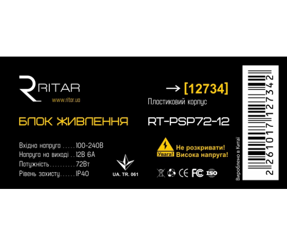 Імпульсний блок живлення Ritar RTPSP72-12 - призначений для живлення енергією світлодіодних стрічок, систем освітлення, відеоспостереження та ін. Даний адаптер крім подачі енергії, стабілізує напругу в цих системах. За рахунок цього досягається максимальний рівень продуктивності і збільшується термін експлуатації.