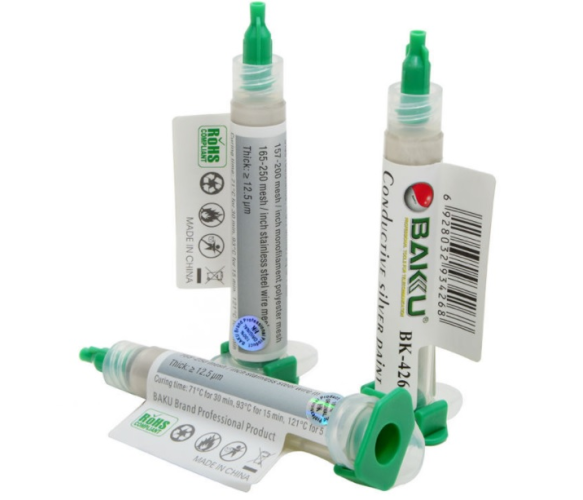 Baku BK-426 - це сіра струмопровідна паста на основі срібла для відновлення доріжок паяння в електроніці. Має температуру засихання:70 °C-30 хв,93 °C-15 хв,121 °C-5 хв.