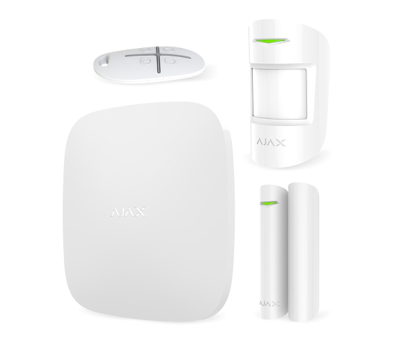 Ajax StarteKit – стартовий комплект бездротової системи безпеки Ajax. У набір входять інтелектуальна централь Ajax Hub, датчик руху Ajax MotionProtect, універсальний датчик відкриття вікна/двері Ajax DoorProtect та брелок для керування охоронною системою Ajax Space Control.