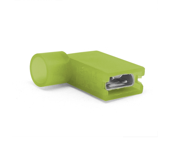 Опис: Наконечник кабельний кутовий ножовий (гніздо) призначений для використання в електричних з'єднаннях. Він повністю ізольований та має кутову форму, що забезпечує зручність при підключенні кабелів.