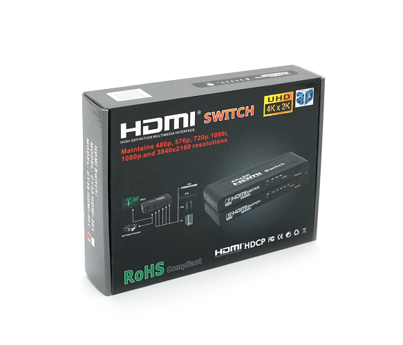 HDMI свіч 3D 4k x 2k- призначений для підключення до 5 пристроїв по HDMI до одного HDMI входу ТВ або монітора. Також є функція перемикання, яка може перемикати кілька сигналів HDMI на пристрій відображення високої чіткості, таке як HDTV, за допомогою кнопки ручного управління або дистанційним пультом.