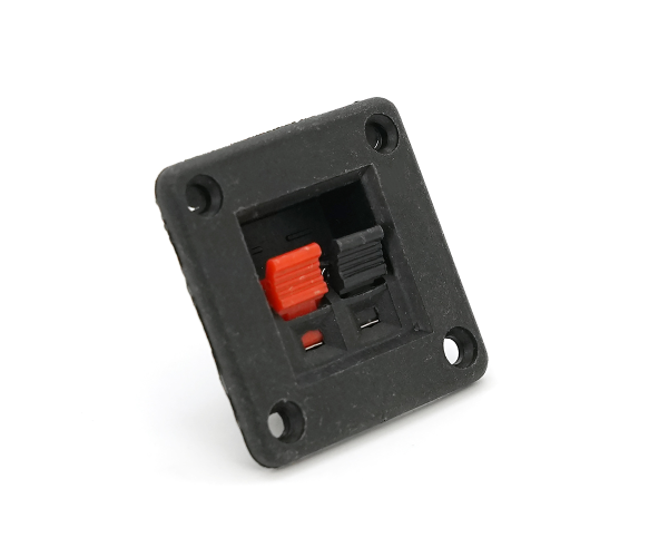 Затискач 2-pin JR6258A для динаміка розмір панелі 42 x 42 мм - це високоякісний затискач для динаміка, який використовується для підключення динаміків до підсилювача або іншого обладнання. Затискач виготовлений із міцного пластику та має два контакти для підключення динаміків. Затискач має розмір 42 x 42 мм та чорний колір.