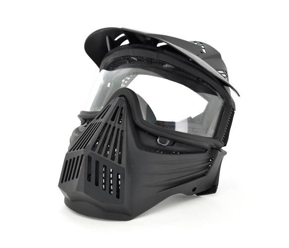 Захисна маска з козирком призначена для гри в пейнтбол та виготовлена з чорного пластику.