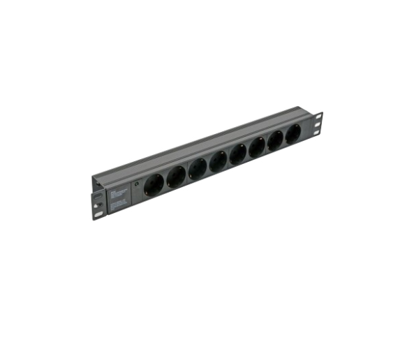 Цей блок Kingda 19" має 8 розеток за німецьким стандартом. Він має номінальний струм 10А, індикатор, не має шнура, чорного кольору та займає 1U у стійці.