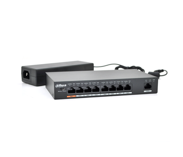 Комутатор - незамінна складова в обладнанні відеоспостереження. Dahua випустила для своєї продукції 8-портову модель із номером PFS3009-8ET-96. У пристрої є 8 вхідних та 1 вихідний Ethernet-порт. Підтримується протокол PoE з режимом CCTV. Передача по ньому можлива з відривом до 250 метрів, тоді як у стандартному — максимум до 100м. На передній панелі є перемикач. Залежно від вибраного режиму максимальна швидкість обмежується 10 або 100 Мбіт/с. Комутатор досить легкий та компактний. Важить менше 500 грамів і має ширину 19 сантиметрів. Крім фільтрації та розподілу трафіку, має блискавкозахист до 2 кВ. PFS3009-8ET-96 не тільки комунікує відеокамери, але й піклується про їх збереження.
