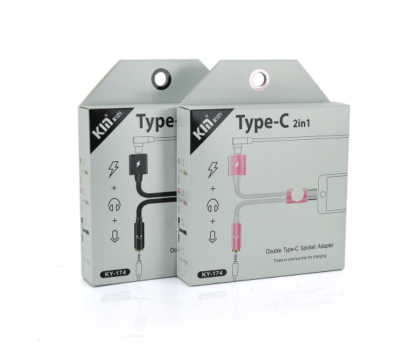 Перехідник 2 в 1 KY-174 Type-C(M) =>Type-C(F) + Jack 3.5mm(F), 5см, білий/рожевий, упаковка