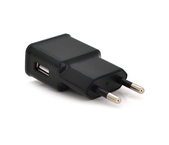 Опис: Цей продукт є зарядним пристроєм для електронних пристроїв, що працює від мережі змінного струму 110-240V. Воно має один порт USB та надає напругу 5V і струм 2A. Колір корпусу – чорний. Пристрій упакований у блок-блістер.
