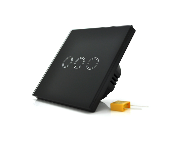 Опис: Сенсорний вимикач AOYAN, триканальний, Black, 86х86х35мм, призначений для керування освітленням у приміщеннях за допомогою дотику.