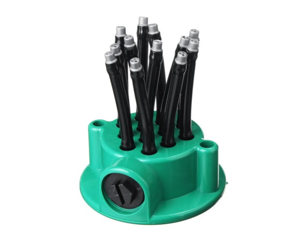 360-градусний автоматичний багатоголовний садовий спринклер – це пристрій для поливу саду, який розподіляє воду на 360 градусів навколо себе. Він зазвичай оснащений кількома головками чи форсунками, які розпорошують воду на всі боки, забезпечуючи рівномірний полив усієї площі. Цей тип спринклер часто використовується для автоматичного поливу газонів, квітників та інших ділянок землі в саду або на газоні.