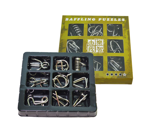 Цей металевий пазл складається з дев'яти предметів, які з'єднуються між собою, утворюючи цілісне зображення або форму.
