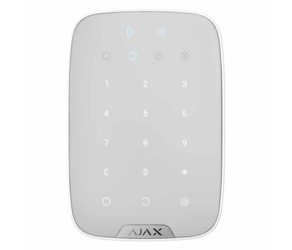 Ajax KeyPad Plus — бездротова сенсорна клавіатура для керування системою безпеки Ajax за допомогою захищених безконтактних карток та брелоків. Забезпечує дальність зв'язку з Hub-ом до 1700 метрів по радіопротоколу Jeweller, який використовує фрейми для синхронізації сеансів зв'язку, автентифікацію для запобігання підміні та шифрування для захисту від злому. Робочі частоти 8680-8686 МГц. Встановлюється у приміщенні біля вхідних дверей для швидкого доступу до клавіатури. Живлення: 4 батареї AA, 1.5 Ст.