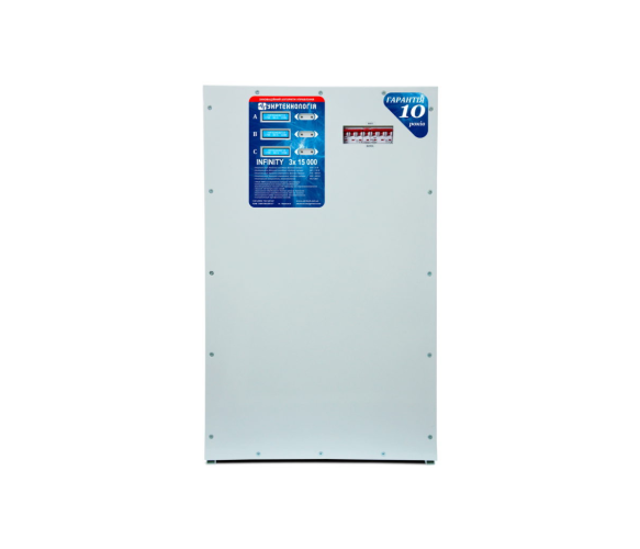 Стабілізатор трифазний напруги складається з трьох незалежних стабілізаторів НСН зібраних і комутованих в одному корпусі. Конструктивно стабілізатор виконаний у металевому корпусі, що дозволяє експлуатувати його в варіанті підлоги. На лицьовій панелі розташовані РК індикатори, що показують (за замовчуванням) рівень вхідної та вихідної напруги, струм та номер ступеня.