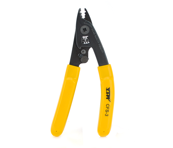 Stripper CFS-3 - інструмент без якого неможливо виконати електромонтажну роботу, тому що для початку необхідно зняти ізоляцію, зачистити кабель. Стріппер справляється з цим завданням на ура! Дбайливо, з турботою про нутрощі кабелю, інструмент розрізає оболонку, без особливих зусиль. Він оснащений трьома отворами для різних завдань. Перше знімає верхню оболонку товщиною 2-3 мм (патчкорд, друге для зняття оболонки 0,9 мм (пігтейл), а третє для роботи з 250 мкм захисним покриттям. Стріппер здається чимось складним, але з ним легко впорається навіть новачкиі в кабельних справах .