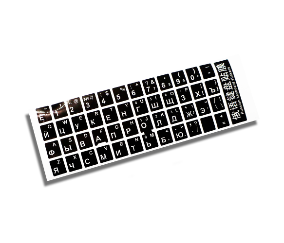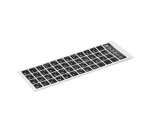 Наклейки на клавіатуру чорного кольору з білими літерами призначені для зручності використання клавіатури з можливістю перемикання між російською та англійською мовами.
