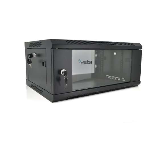 Шафа Merlion 4U. Привабливий зовнішній вигляд, двері із загартованого скла, непомітний чорний колір. У верхній кришці шафи передбачено місце для встановлення вентилятора охолодження. Зовнішня висота складає 279 мм, зовнішня глибина – 600 мм. Бічні двері – знімні на замках. Передні двері із загартованого скла з наявністю замку для запобігання небажаному доступу до обладнання.