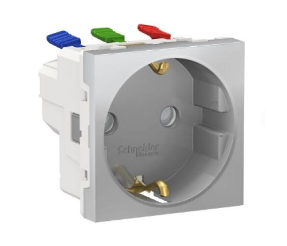 Розетка Schneider Unica є елегантним пристроєм із заземленням і захисними шторками, виготовленим з алюмінію.