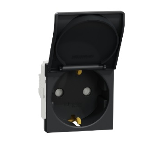 Розетка Schneider Unica із заземленням, захисними шторками та кришкою у кольорі антрацит.