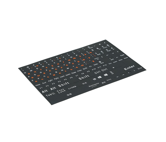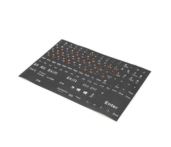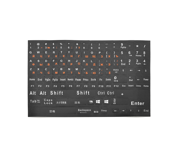 Наклейки на клавіатуру чорні з білими англійськими літерами та помаранчевими російськими літерами, Q500