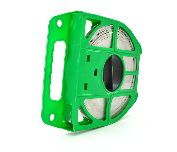 Виконана бандажна стрічка з нержавіючої сталі, але при цьому вона залишається гнучкою, міцною та зручною у використанні. Поставляється у захисній касеті, що сприяє компактному зберіганню
