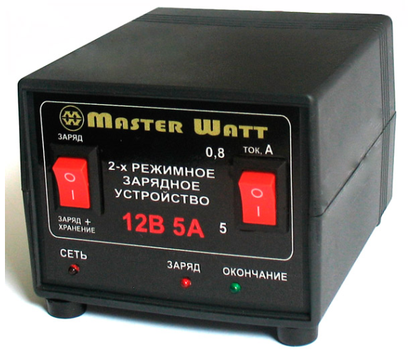 Зарядний пристрій має перемикач для обмеження струму заряду на два положення: 0,8А - для заряду АКБ малих ємностей (4.5 - 16А*год) і 5А - для заряду АКБ великих ємностей (20 - 100А*год).