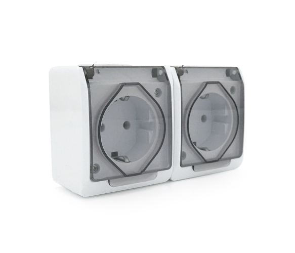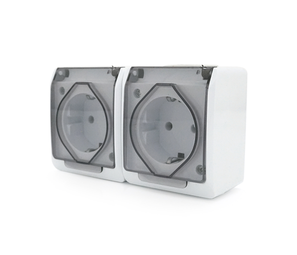 Опис: Розетка подвійна без заземлення призначена для зовнішнього монтажу та забезпечує захист від пилу та бризок води. Має білий колір та кришку для захисту від погодних умов.