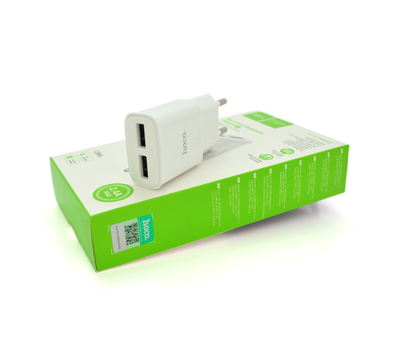 Мережевий зарядний пристрій HOCO C88A з вхідною напругою від 110 до 240 В,білого кольору, з двома USB-портами, які забезпечують максимальну вихідну потужність до 2.4A. Поставляється у білій коробці.