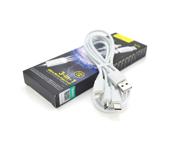 Опис: Кабель HOCO X74 USB-1 3 в 1 Micro/Iphone/Type-C - це універсальний кабель, який підходить для використання з різними пристроями. Він забезпечує швидку зарядку та передачу даних, має довжину 1 метр, поставляється у білому кольорі та упакований у коробку.