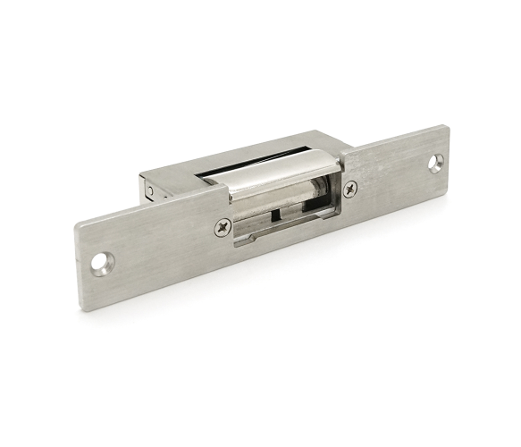 Електромеханічна клямка з короткою планкою, NC (при подачі живлення відкривається), функція розблокування, механічного регулювання, 12В/700мА. Для вузьких дерев'яних та металевих дверей.