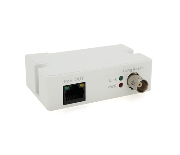 Передавач (LR1002-1ET). Призначений для перетворення сигналу з інтерфейсу BNC на інтерфейс RJ45, підтримує передачу живлення на великі відстані по коаксіальному кабелю.