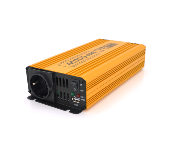 Інвертор напруги MXSPSW-600-12S - використовується для перетворення електрики 12В на 220В. Дозволяє підключати навантаження до 600Вт. На лицьовій стороні пристрою розташовані розетка, кнопка вкл/викл, світлодіоди, а також роз'єм USB для зарядки ваших гаджетів. На зворотному боці пристрою клем для підключення проводів акб, вентилятор для активного охолодження пристрою, запобіжники.