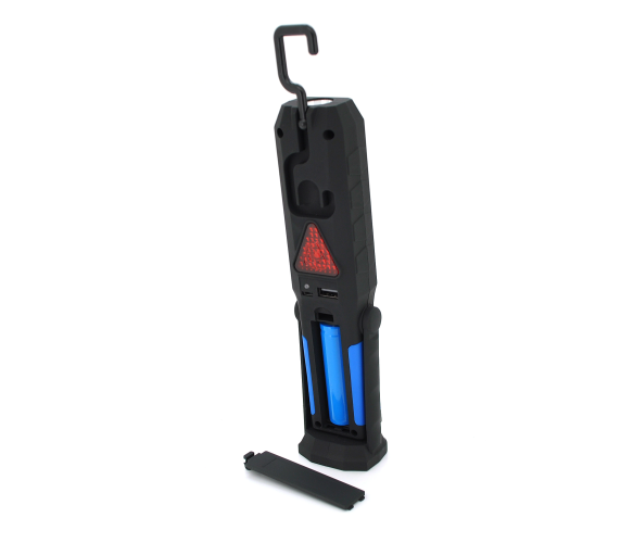 Верхня частина ліхтарика оснащена гачком для підвішування, за рахунок якого його зручно використовувати на підприємствах, для кемпінгу, ремонту автомобілів, на СТО тощо. Девайс працює від акумуляторів 18650 і заряджається через порт USB.