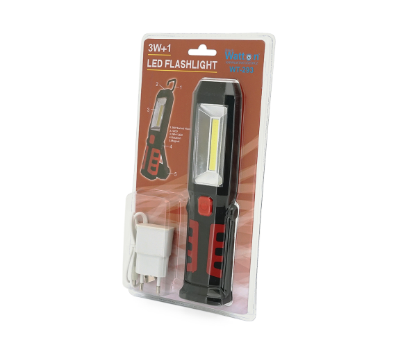 Ліхтарик Watton WT-293 використовує нову технологію COB LED, що забезпечує яскраве освітлення. Пристрій оснащений двома потужними магнітами на нижній частині корпусу для кріплення металевої поверхні.