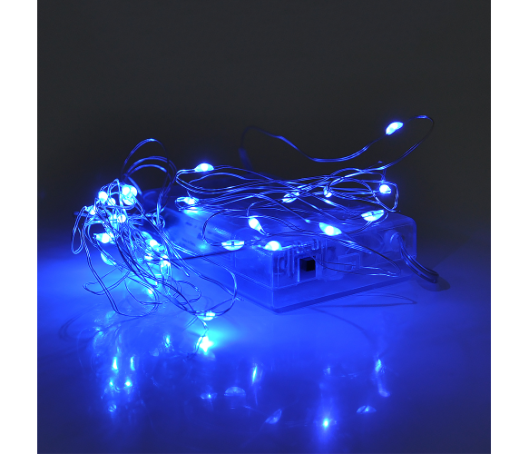 Опис: Гірлянда 20LED з 1 режимом, довжиною 3 метри, з прозорою ізоляцією, працює від 3 батарейок типу АА (не входять до комплекту), колір - синій, поставляється в коробці.