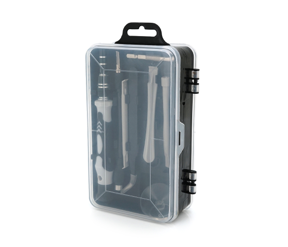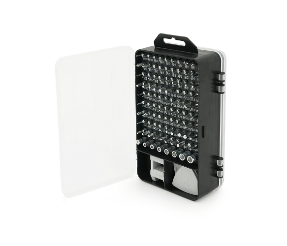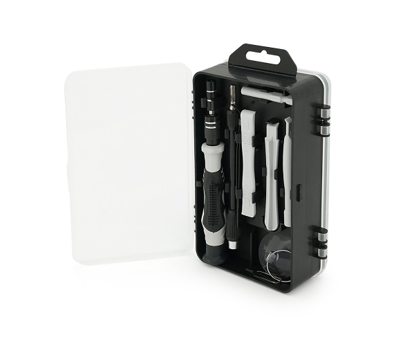 - Включає: викрутка, 98 біт, подовжувач, гнучкий вал, антистатичний браслет, пінцет, пластикові лопатки, присоска, магнітний килимок