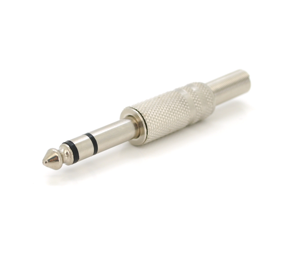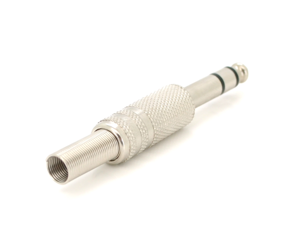 Таким чином, це роз'єм стерео 6,3 мм з рифленою текстурою, обладнаний пружиною для фіксації кабелю, виготовлений з сірого металу.