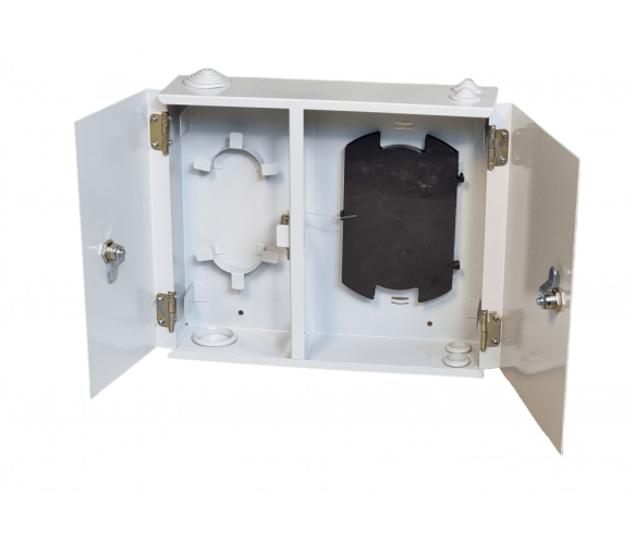 Настенный двухдверный оптический бокс 355х305x95 позволяет разделывать до 32 оптических волокон.