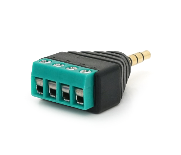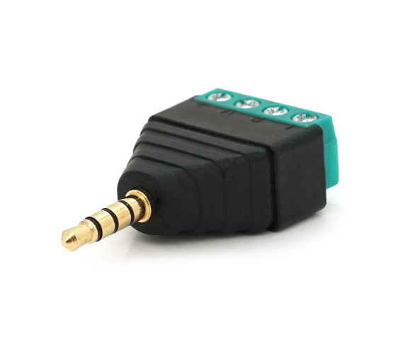 Роз'єм тато штекер mini-jack 2.5 мм стерео 4 контакту з колодкою призначений для простого та надійного з'єднання елементів у системах передачі аналогового аудіосигналу для відтворення та запису звуку та передачі відеосигналу. Кабель фіксується на роз'ємі гвинтовим затискачем (під викруткою), що забезпечує швидкий монтаж та надійне з'єднання кабелю з конектором. Роз'єм має чотири контакти (стерео): 1 – земля (GND), 2 – R (сигнал правого каналу), 3 – L (сигнал лівого каналу), 4 – V (сигнал video – для відео або мікрофона)