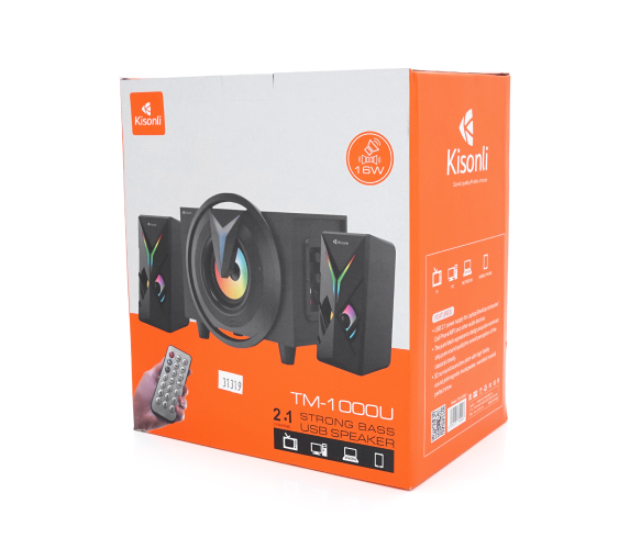 Колонки Kisonli TM-1000U є компактною акустичною системою з сабвуфером і різними функціональними можливостями, такими як USB/TF/BT/FM/AUX/LED світло. Вони мають високу потужність звуку і стильний чорний дизайн, що робить їх ідеальним вибором для прослуховування музики.