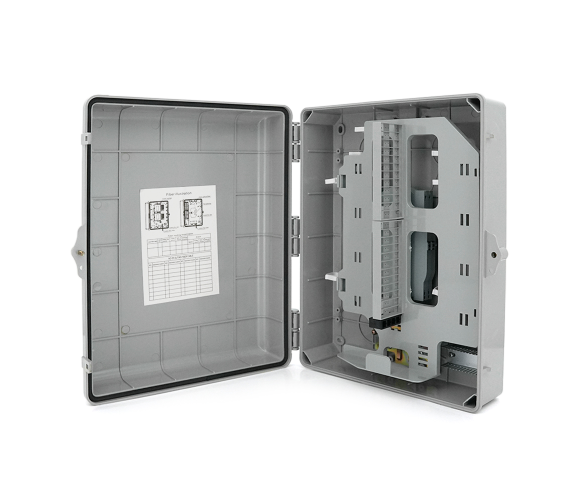 Комутаційна коробка для організації та захисту волоконно-оптичних з'єднань у пасивних мережах (PON). Призначений для розподілу сигналу між 48 абонентами через SC-адаптери. Міцний корпус із ABS-пластику із захистом IP65 забезпечує надійну роботу у вуличних умовах.