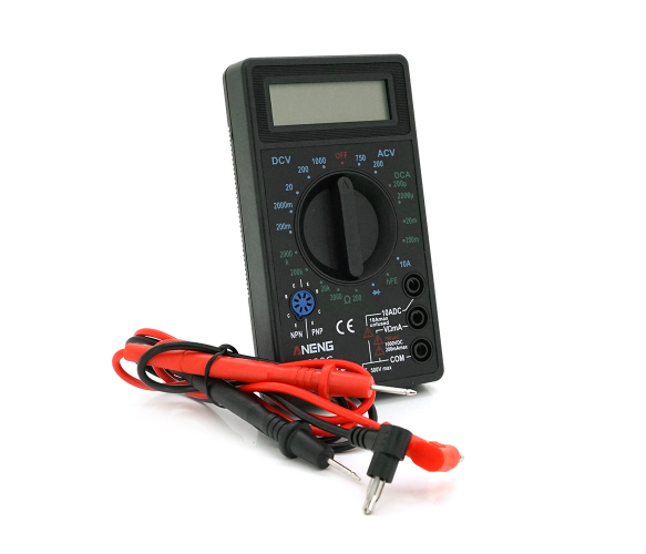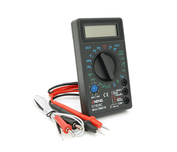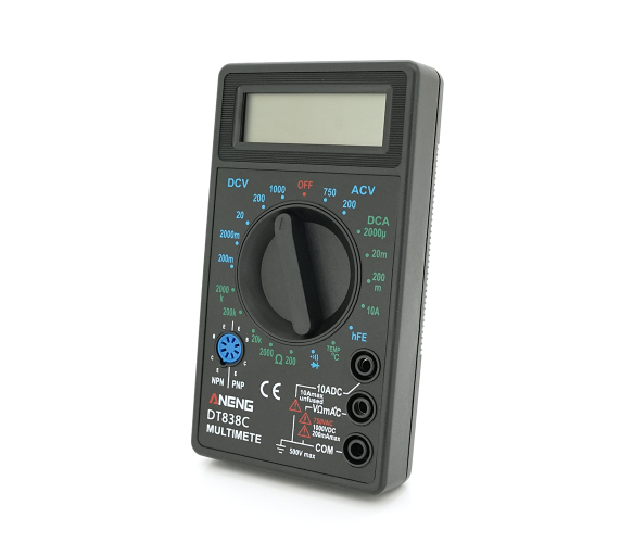 - Портативний цифровий мультиметр для вимірювання AC/DC напруги, DC струму, опору та тестування транзисторів та діодів.