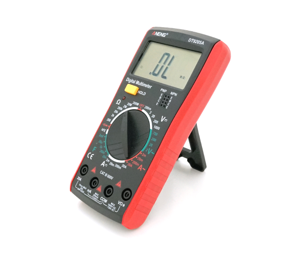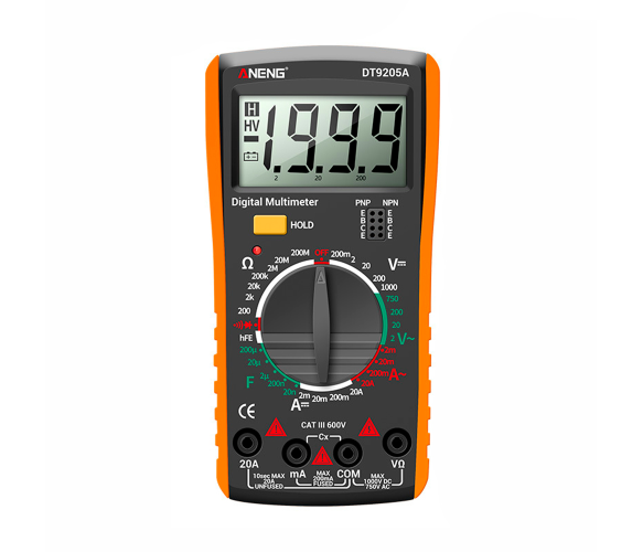 Мультиметр ANENG DT9205A - це професійний електричний ручний тестер, призначений для вимірювання напруги (V), струму (A), опору (R), ємності (C), температури (T), а також з функцією вимірювання коефіцієнта посилення транзисторів (hFE). Це універсальний інструмент, який буде незамінним помічником для любителів електроніки, електротехніків та спеціалістів з ремонту електронної техніки.