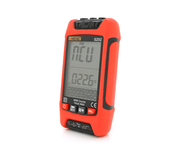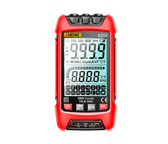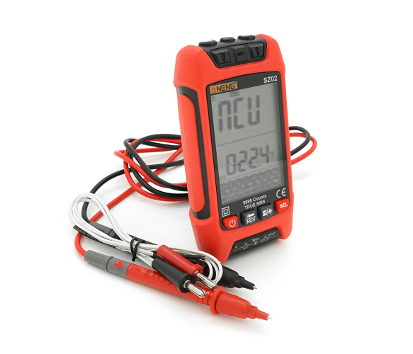ANENG SZ02 - це портативний цифровий мультиметр з автоматичним вибором діапазону та істинним середньоквадратичним значенням з живленням від батарей і великим РК-дисплеєм на 9999 відліків. Мультиметр дає змогу вимірювати в автоматичному режимі напругу, силу струму, опір, частоту, ємність, температуру, а також має вбудований NCV тестер і функцію визначення фазного та нульового провідників.