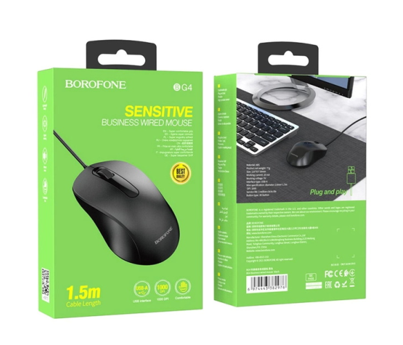 Дротова миша BOROFONE BG4 в чорному кольорі є зручним і стильним пристроєм для керування комп'ютером. Вона має компактний корпус, що робить її ідеальним рішенням для використання як удома, так і в офісі.
