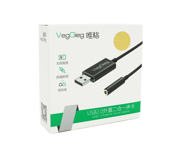 Опис: Перехідник для навушників VegGieg V-K201 USB2.0(M)-Jack3.5(F), чорний, у коробці.Характеристики:- Тип з'єднання: USB 2.0 (чоловічий) - Jack 3.5 (жіночий)- Колір чорний- Упаковка: коробка