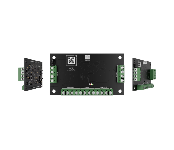 Модуль Ajax LineSplit Fibra розгалужує одну лінію Fibra на чотири. Плата підключається до будь-якої точки лінії Fibra і розгалужується на чотири лінії. Кожна вихідна лінія пристрою може мати довжину до 2000 м при підключенні за допомогою крученої пари U/UTP cat.5.